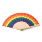 Wachlarz z drewnianym stelażem i wielobarwną tkaniną.