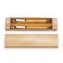 Zestaw piśmienniczy obejmujący długopis oraz ołówek z przyciskowym mechanizmem. Wykonane z bambusa z metalowymi elementami wykończenia. Produkty umieszczone w eleganckim kartonowym pudełku z fakturą drewna. Możliwość znakowania. Wkład w kolorze niebieskim. Doskonały pomysł na upominek lub gadżet reklamowy.
