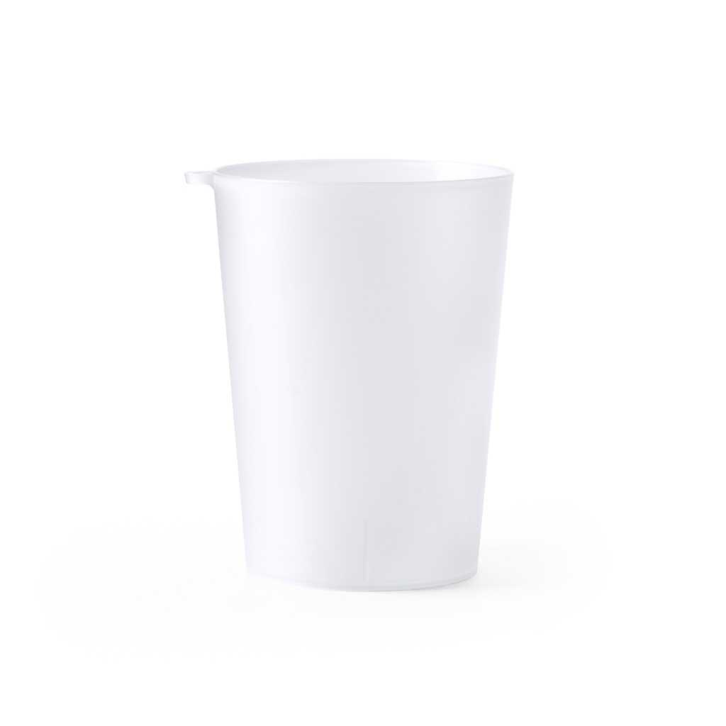 Elastyczny kubek z polipropylenu o pojemności 500 ml, przeznaczony do wielokrotnego użytku, wyposażony w praktyczny pierścień. Półprzezroczyste wykończenie.