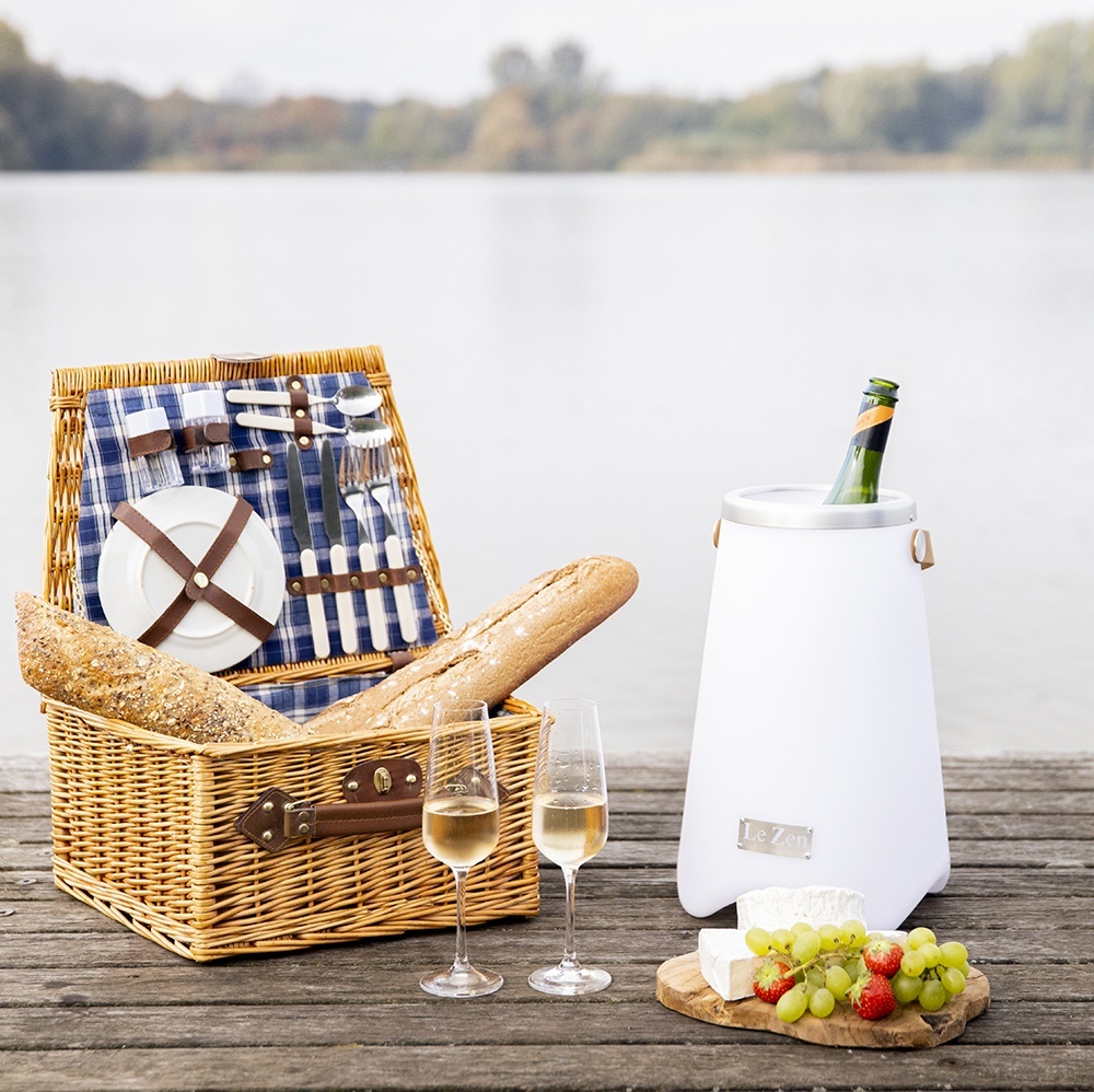 Le Zen Original to elegancka chłodziarka do wina z bezprzewodowym głośnikiem Bluetooth oraz efektownym oświetleniem LED otoczenia. Lampka nastrojowa oferuje 7 różnych kolorów, które można łatwo zmieniać przy użyciu dołączonego pilota. Cooler jest wodoodporny i odporny na wstrząsy. Rączka z wegańskiej skóry ułatwia przenoszenie — idealna na imprezę, do parku czy na plażę.