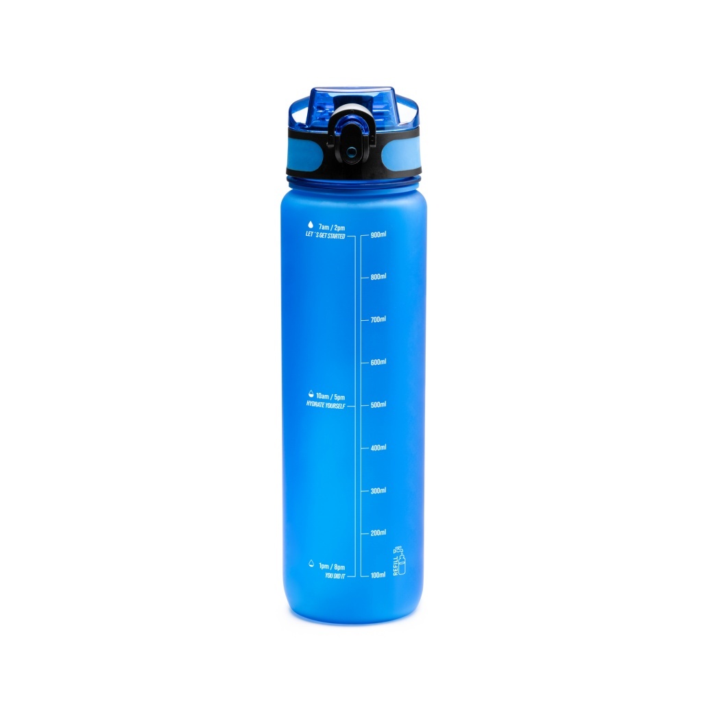 Butelka z tworzywa Tritan posiada półprzezroczysty korpus i dopasowaną zakrętkę z praktycznym uchwytem do przenoszenia. Na ściance znajdują się wskazówki dotyczące nawodnienia oraz oznaczenie pojemności, co ułatwia kontrolę przyjmowanej ilości płynów. Produkt łączy użyteczność z estetyką.