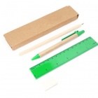 Zestaw 5-częściowy zapakowany w kartonik typu kraft; zawiera długopis w tekturowym korpusie i niebieskim tuszu, drewniany ołówek, temperówkę, gumkę oraz 15 cm. linijka.