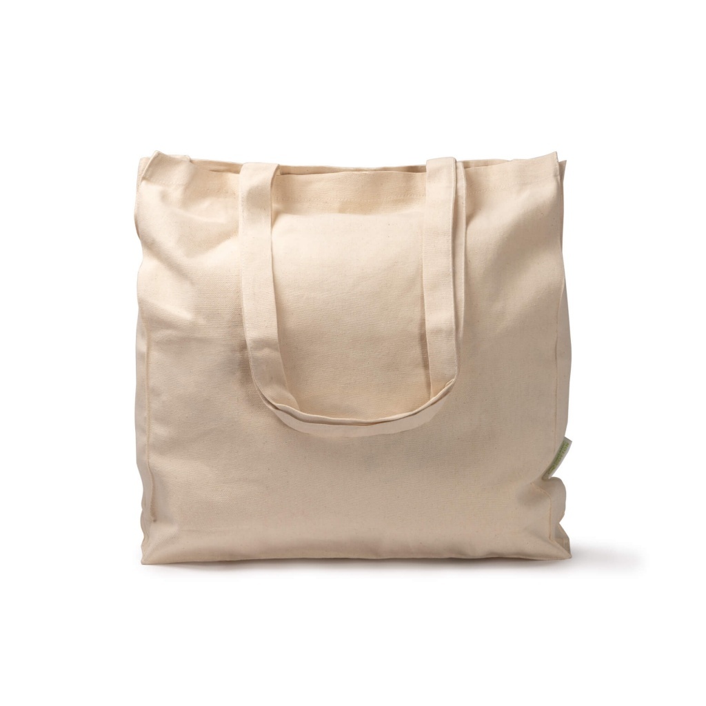 Torba uszyta w 100% z bawełny organicznej o gramaturze 220 g/m², z naturalnym wykończeniem i wstawkami u podstawy oraz po bokach. Paski o długości 70 cm.