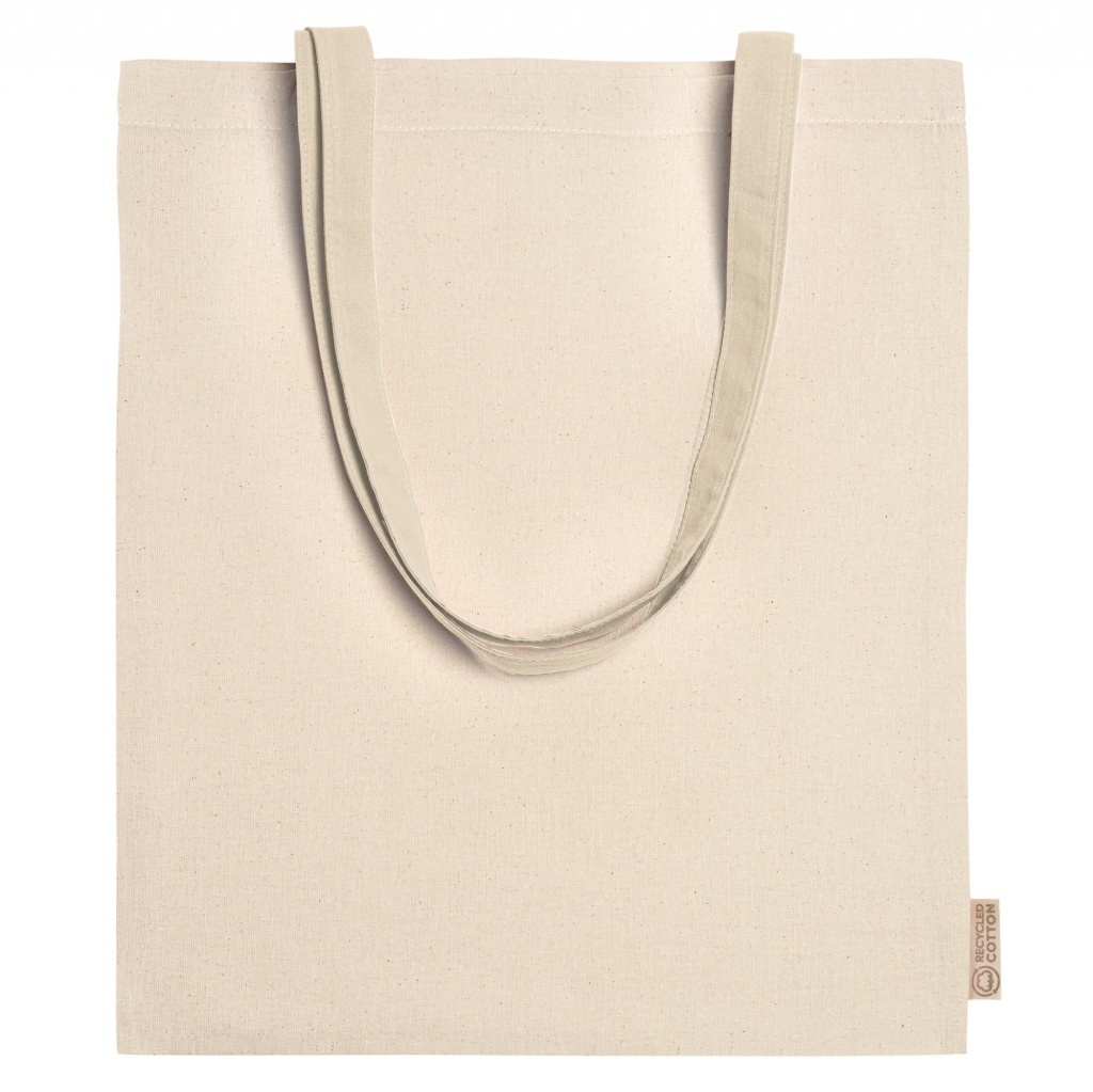 Torba z tkanin mieszanych — 70% bawełny z recyklingu oraz 30% poliestru z recyklingu, gramatura 140 g/m². Paski długości 70 cm.