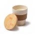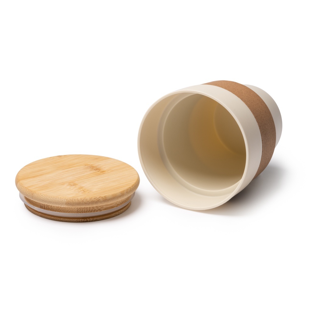 Kubek wykonany z polipropylenu z recyklingu; opaska z korka i pokrywka z bambusa.