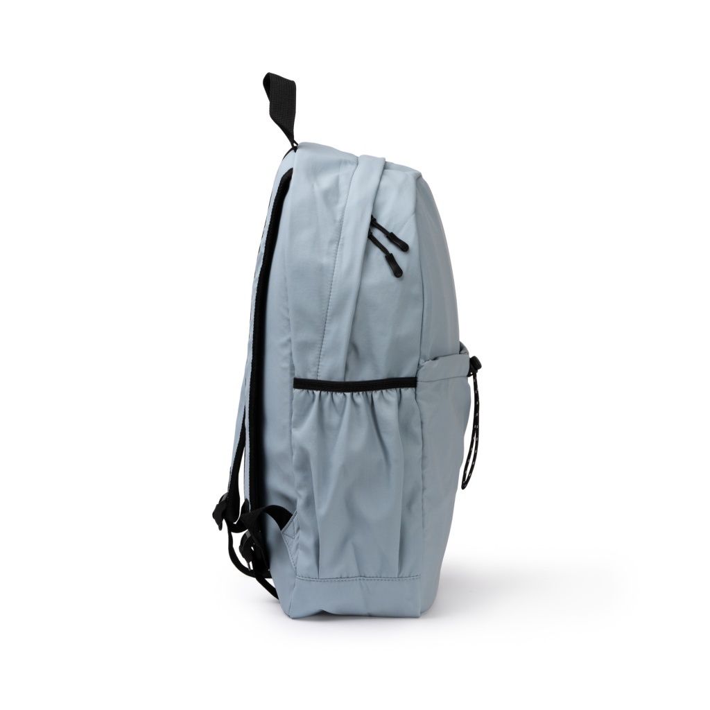 Plecak z miękkiego nylonu wyposażony w główną komorę z wyściełaną przegrodą na laptopa do 16 cali oraz małą kieszonkę na zamek. Po bokach dwie kieszenie na butelki z elastycznymi paskami dla lepszego trzymania.