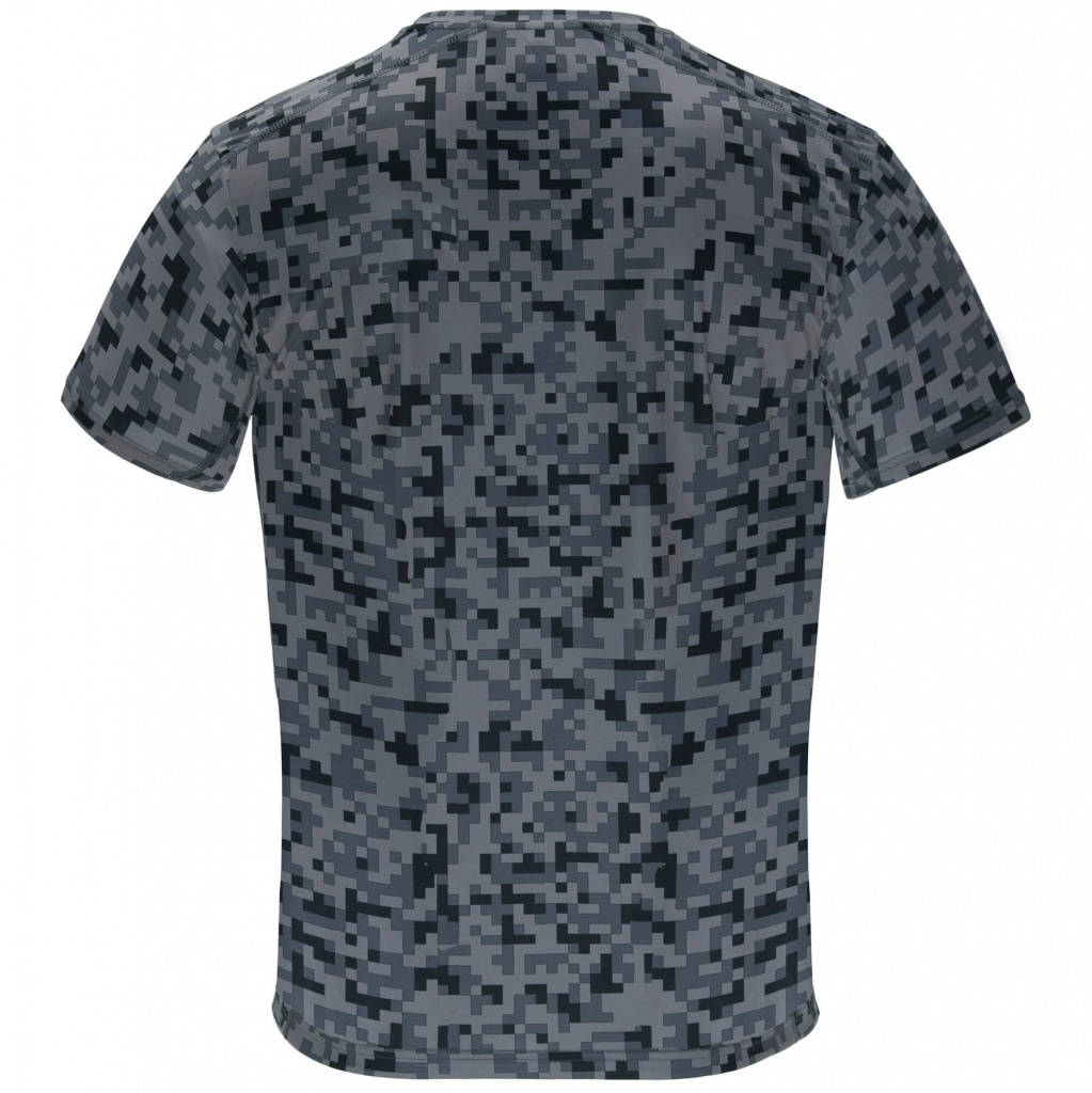 Techniczna koszulka we wzorki z krótkim rękawem z okrągłym dekoltem. Posiada wzmocnione, kryte szwy na karku w kolorze fluorescencyjnym oraz boczne i pachowe panele w tym samym kolorze.