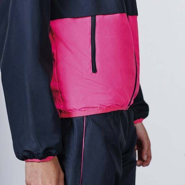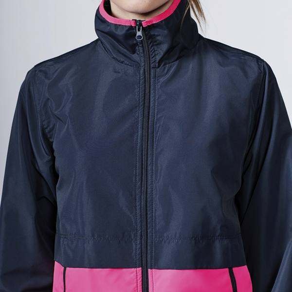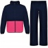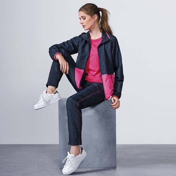Komplet damski złożony z bluzy i spodni. Zamki błyskawiczne w kontrastowym kolorze. Nogawki spodni ze ściągaczem. Podszewka z siatki.