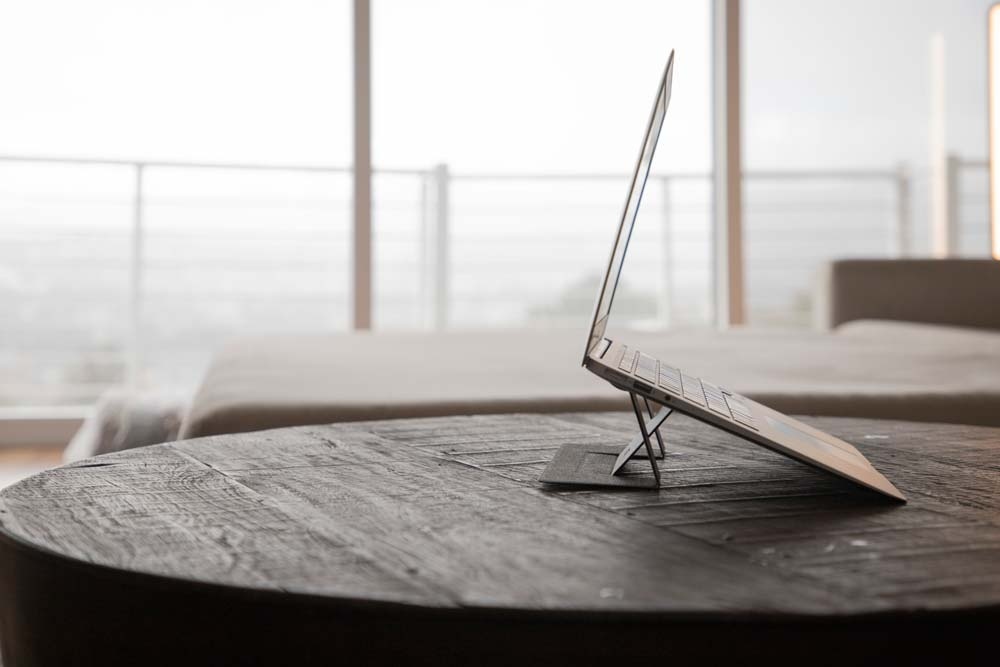 Łączy się z laptopem w sposób niemal niewidoczny, jest prosta w montażu i demontażu. Umożliwia szybkie otwieranie i zamykanie, pozostając zamocowana na czas mobilnego użytkowania. Przeznaczona do laptopów o przekątnej od 11,6 do 15,6 cala i nośności do 8 kg. Niezalecana do modeli z otworami wentylacyjnymi w miejscu przylegania. Waga 65,7 grama, grubość 3,04 mm; wykonana z PU i włókna szklanego dla zapewnienia wytrzymałości i stabilności. Produkt łatwy do demontażu i ponownego zamocowania. Dwa tryby pracy: wysoki — do pozycji siedzącej, niski — dla odciążenia nadgarstków. Dostępna w kolorach: złotym, szarym, różowym i srebrnym.
