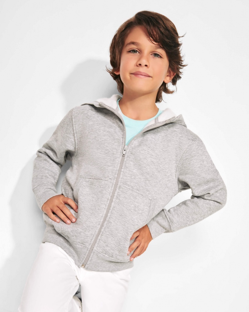 Bluza z kapturem zapinana na zamek błyskawiczny. Elastyczne ściągacze wykończone przy kapturze i przy kieszeniach. Kieszeń w stylu kangurka. Elastyczne ściągacze przy mankietach i w pasie. Usuwalna metka bez rozpruwania krytych szwów.