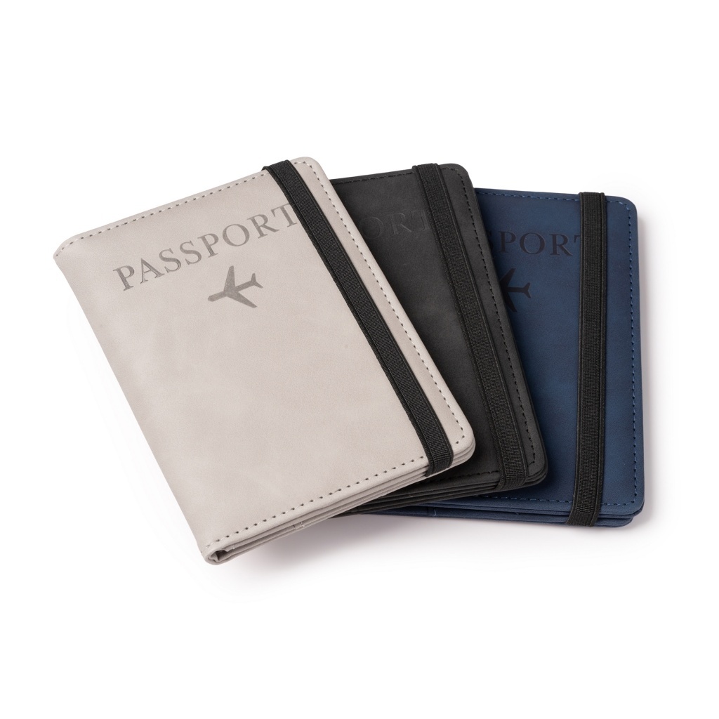 Etui na paszport z ekologiczną skórą PU, zamykane elastycznym paskiem. Posiada 3 kieszenie wewnętrzne na paszport i dokumenty, 4 kieszenie na karty oraz 2 kieszenie na karty SIM.
