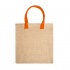 Praktyczna torba z naturalnej juty z kolorowymi, wzmocnionymi bawełnianymi uchwytami. Produkt ma obszyte brzegi, co zwiększa jego trwałość i estetykę.