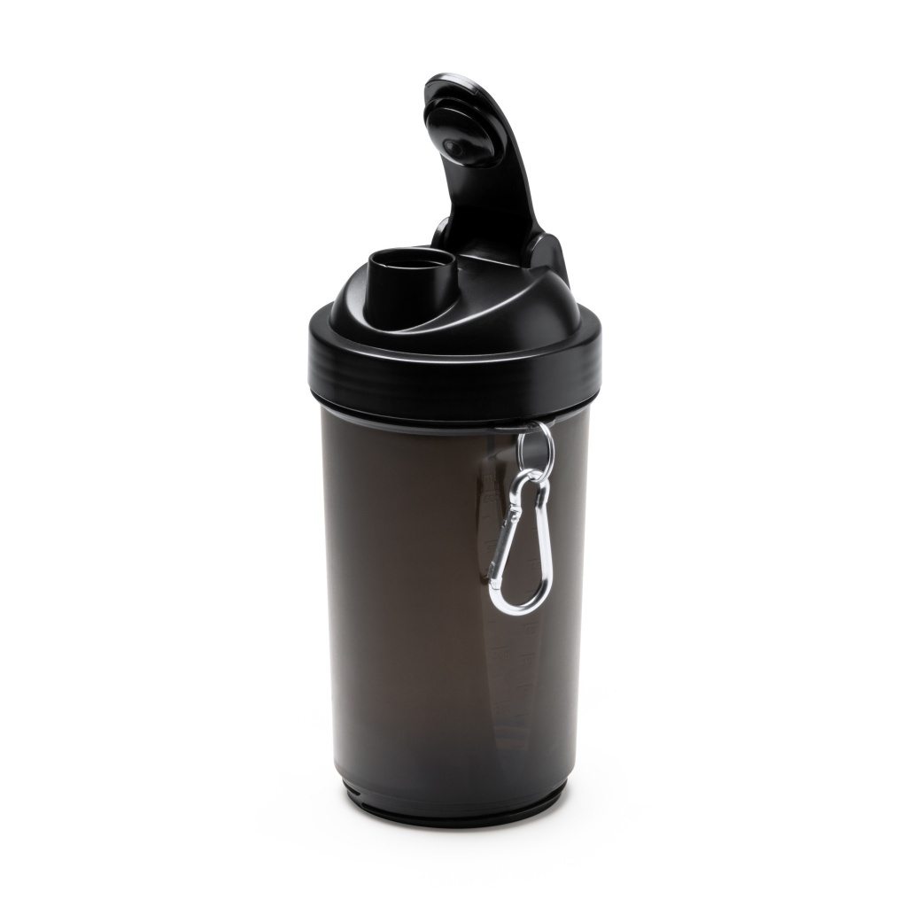 Shaker z polipropylenu z mieszadłem ze stali nierdzewnej 304. Dozownik z polipropylenu z komorami na suplementy. Pojemność: 600 ml. W komplecie karabińczyk. Zapakowany w eleganckie pudełko.
