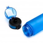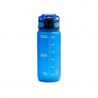 Półprzezroczysta butelka z tworzywa Tritan, wyposażona w wygodny uchwyt do przenoszenia oraz praktyczny wskaźnik poziomu płynu i oznaczenia ułatwiające kontrolę nawodnienia.