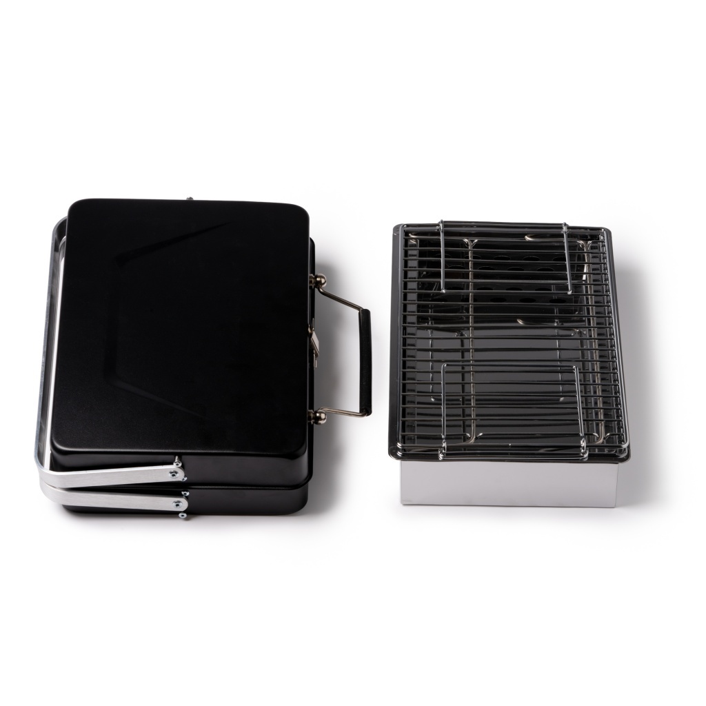 Przenośny grill na węgiel drzewny zrobiony ze stali nierdzewnej. Składany do rozmiaru teczki, zapakowany w opakowanie zaprojektowane z myślą o środowisku. Wyposażony w uchwyt do przenoszenia.