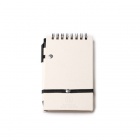 Notes w formacie A6 wykonany z kartonów po mleku pochodzących z recyklingu. Zestaw zawiera elastyczną gumkę oraz długopis z niebieskim atramentem. 80 arkuszy w linie.