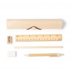 Praktyczny zestaw piśmienniczy z naturalnego drewna w drewnianym etui. Zawiera 5 podstawowych produktów: linijkę, ołówek, długopis z tektury pochodzącej z recyklingu z przyciskiem, gumkę i temperówkę.