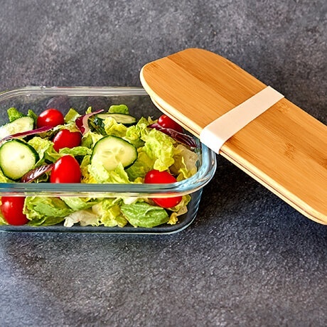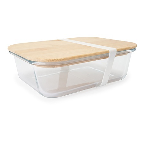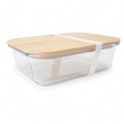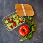 Eleganckie, ekologiczne pudełko na lunch ze szkła, wyposażone w bambusowe wieczko oraz silikonowy pasek ściągający.