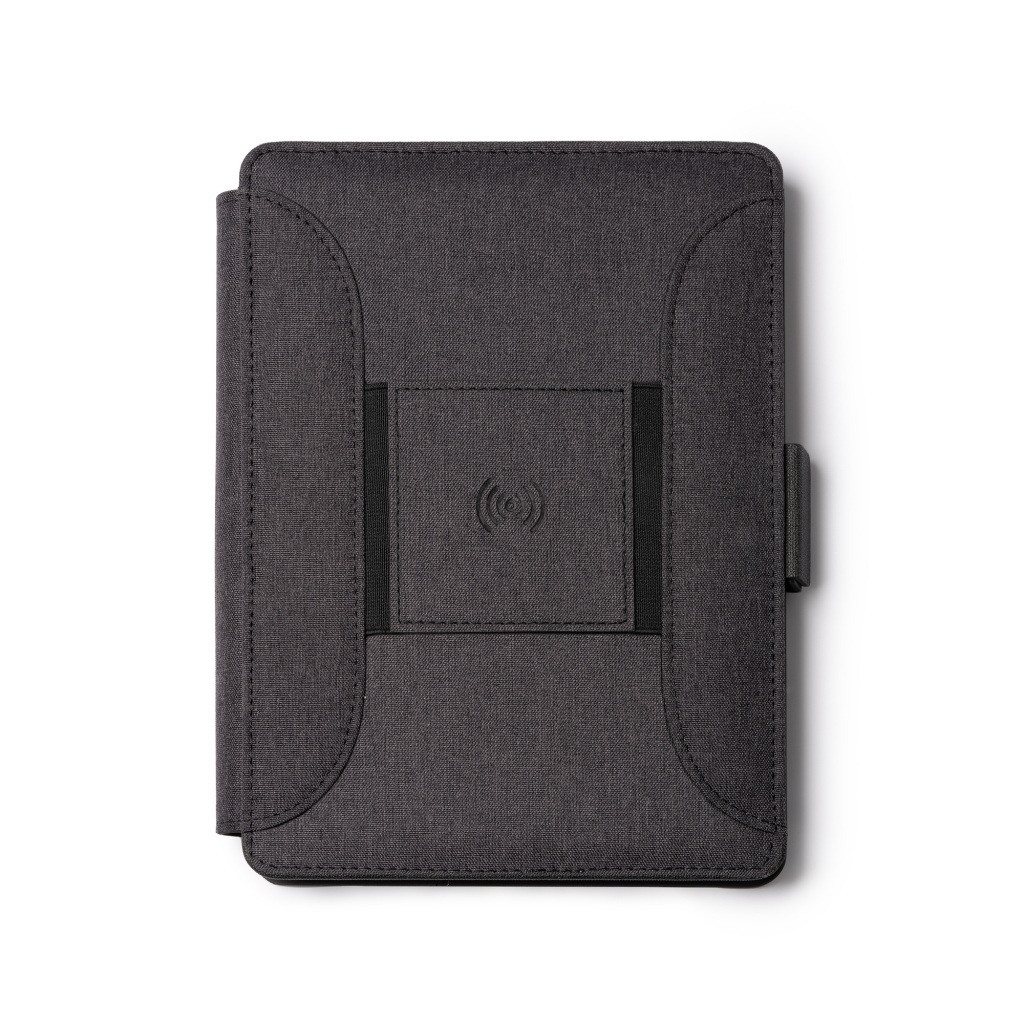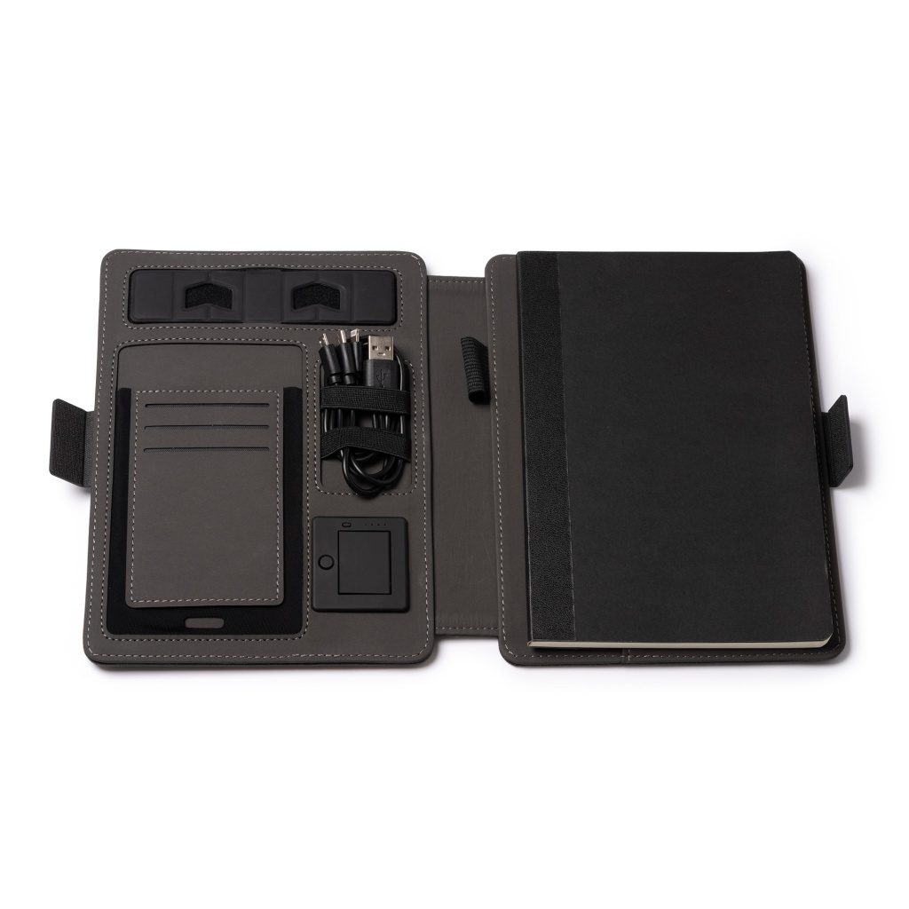 Teczka wyposażona jest w magnetyczne zamknięcie, które zabezpiecza dokumenty i przedmioty w środku. W okładce znajduje się bezprzewodowa ładowarka umożliwiająca wygodne ładowanie urządzeń kompatybilnych z technologią ładowania bezprzewodowego. Wewnątrz znajduje się wyjmowany notatnik zawierający 56 arkuszy oraz przegródka na telefon, zapewniająca jego ochronę i łatwy dostęp. W komplecie będą również uchwyty na kartę i telefon.