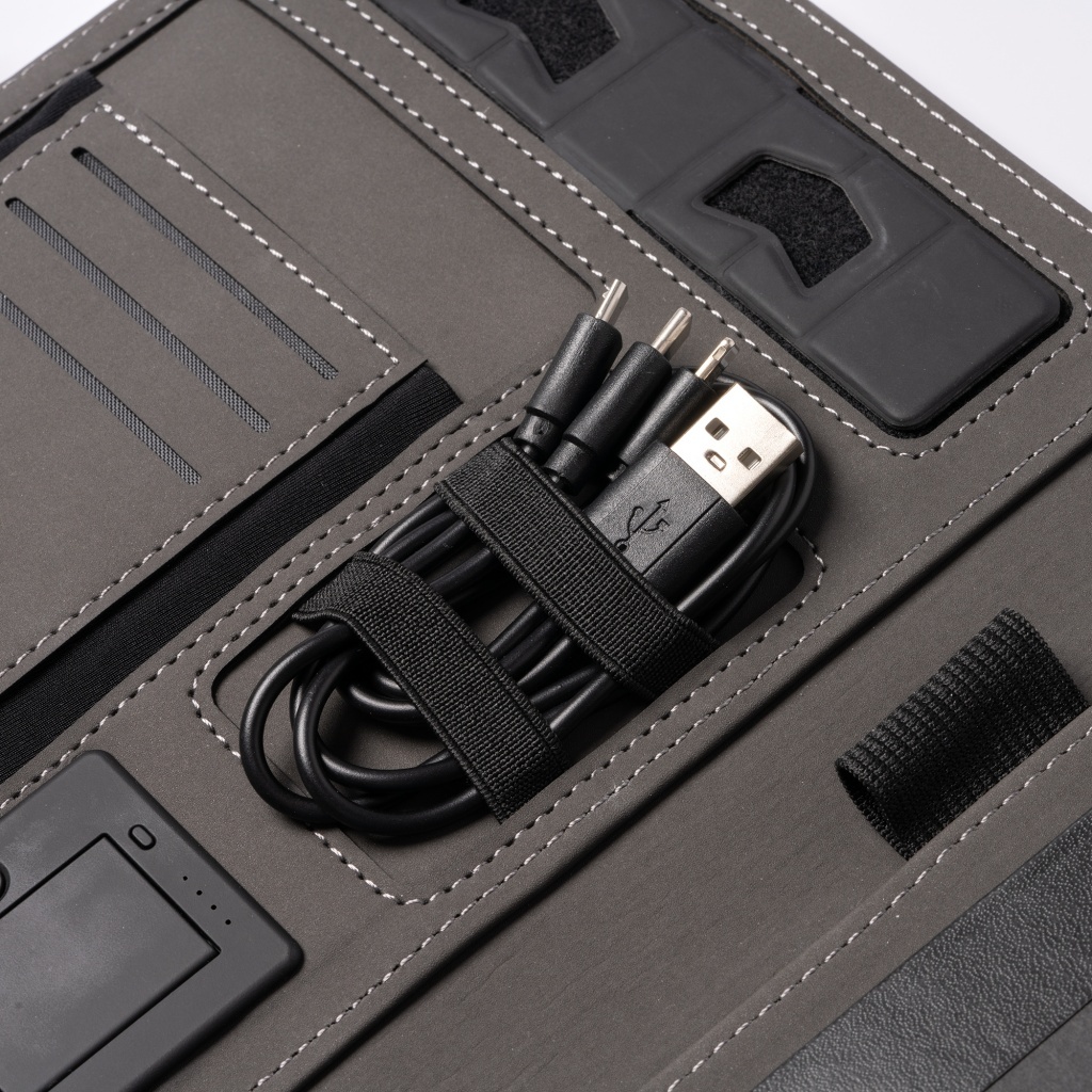 Teczka posiada praktyczny uchwyt na długopis, dzięki czemu narzędzie do pisania jest zawsze pod ręką. Dodatkowo w zestawie znajduje się kabel z trzema wejściami (wyjście USB typu C i USB), co pozwala na ładowanie różnych urządzeń i zapewnia szeroką kompatybilność z elektroniką.