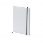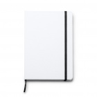 Notatnik w formacie A5 z twardą okładką, przystosowany do sublimacji. Posiada znacznik stron oraz dopasowaną elastyczną opaskę zamykającą. Zawiera 100 arkuszy zwykłego papieru.