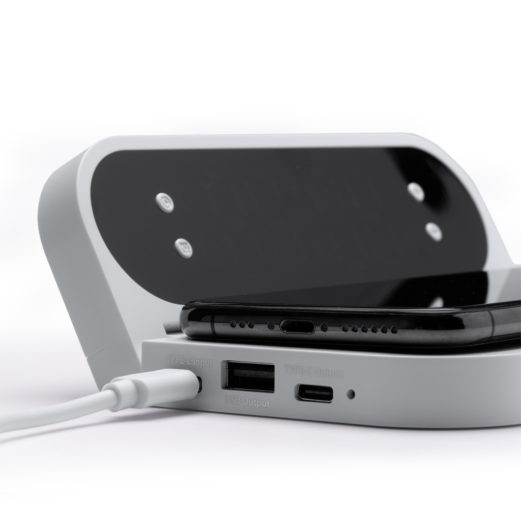 Oprócz bezprzewodowego ładowania o mocy 10 W, urządzenie pełni funkcję zegara — wyświetla aktualny czas i pozwala na ustawienie alarmów, łącząc praktyczność ładowarki z użytecznością zegarka.