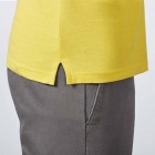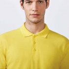 Koszulka polo z krótkim rękawem. Wzmocnione, kryte szwy przy kołnierzyku. Prążkowany kołnierzyk i mankiety. Szwy boczne. Zapięcie na trzy guziczki. Rozcięcia po bokach.
