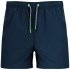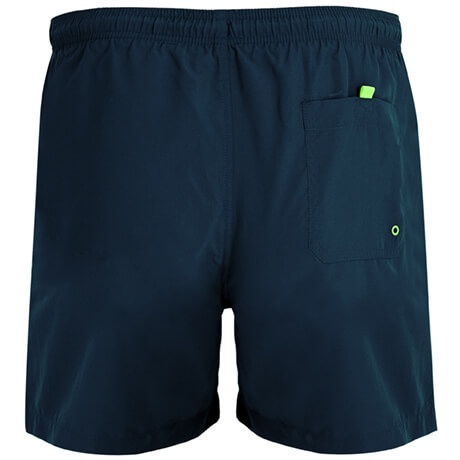 Krótkie spodenki plażowe z dwoma kieszeniami bocznymi. Pas elastyczny z kontrastującym, regulowanym sznurkiem oraz metalowymi oczkami przy kieszeniach. Boczne kieszenie obszyte lamówką. Tylnia kieszeń posiada otwór odpływowy.
