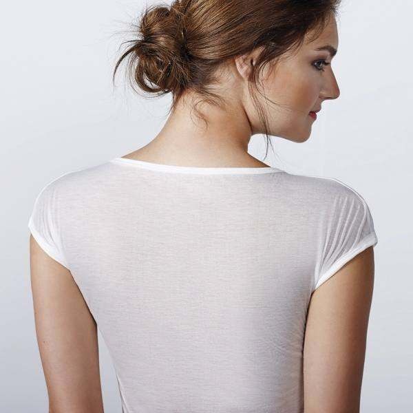Dopasowana koszulka z krótkim rękawem, dekoltem w łódkę. Lamówka przy szyi i rękawach oraz szwy boczne. Wykonana z poliestrowej tkaniny o wyglądzie i dotyku zbliżonym do bawełny.
