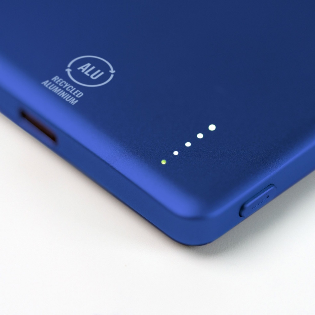 Magnetyczny powerbank o pojemności 5000 mAh z funkcją ładowania bezprzewodowego. Obudowa wykonana z aluminium pochodzącego z recyklingu. Maksymalny prąd wyjściowy: 15 W. W zestawie kabel USB typu C oraz uniwersalny magnetyczny pierścień.