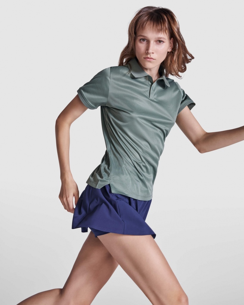 Damska koszulka techniczna polo z krótkim rękawem. Kołnierz z poliestru wykończony ściągaczem 1x1, zapinana na plastikowe, zatrzaskowe guziki w kolorze materiału. Szwy zamaskowane obszyciem w tym samym odcieniu. Rękaw zakończony ściągaczem 1x1 w identycznym kolorze.