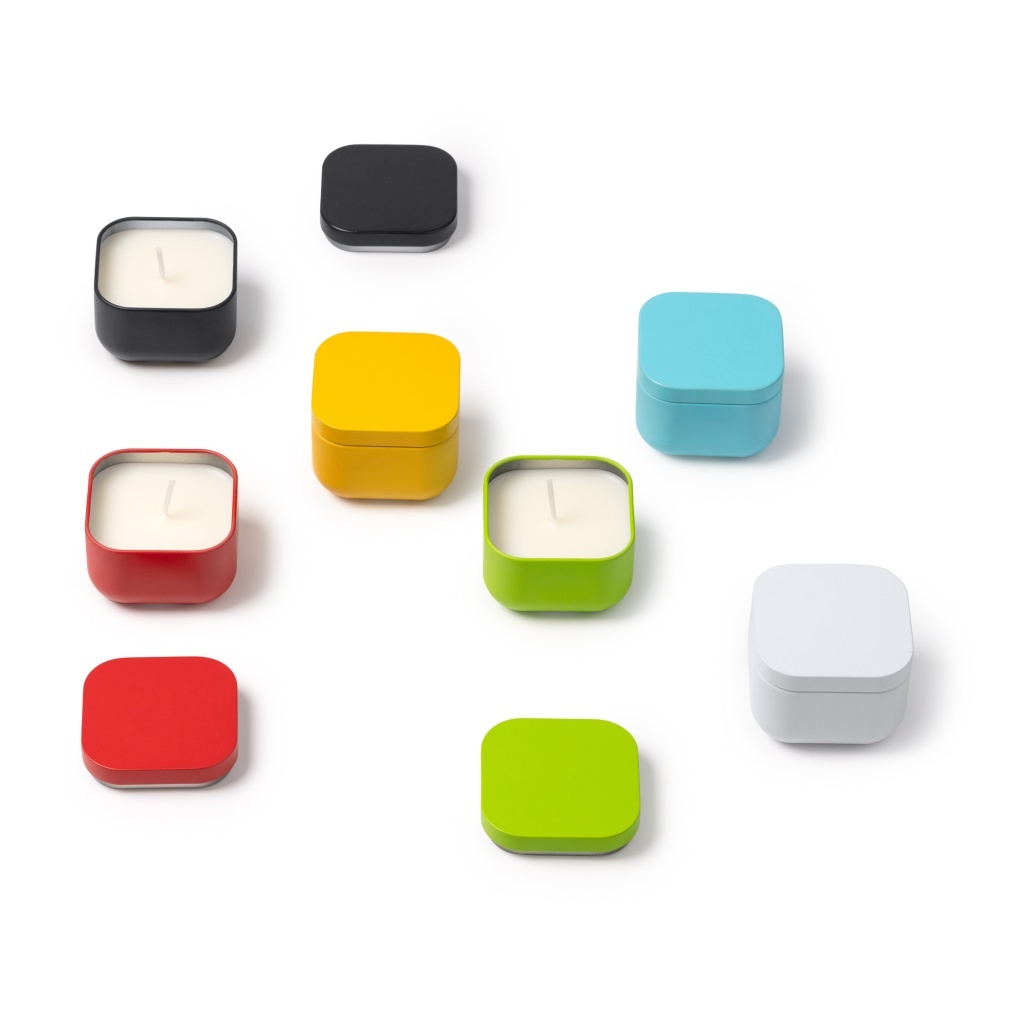 • Trini - Aromatyczna świeca z kwadratową, metalową miską. Wosk roślinny o aromacie lawendy.