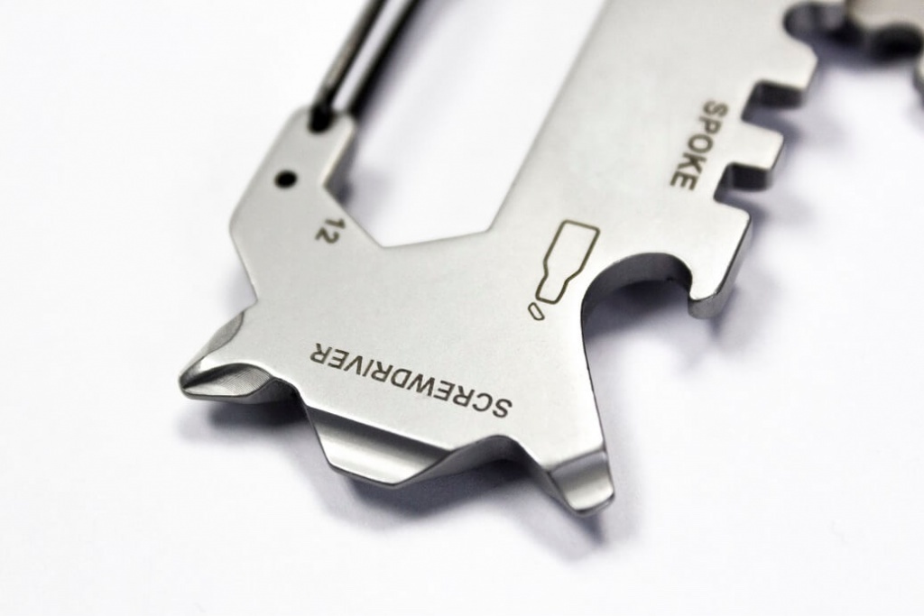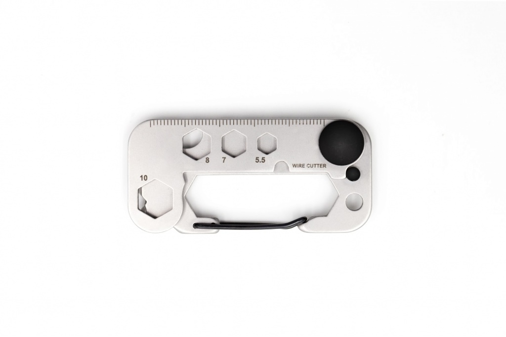 TWIST — praktyczny zestaw 8 narzędzi w eleganckim, rozkładanym breloku (przecinak do drutu, klucz do szprych rowerowych, klucze w rozmiarach 5.5 / 7/8/12, śrubokręt Philips, śrubokręt płaski, linijka, otwieracz do butelek, karabińczyk) .