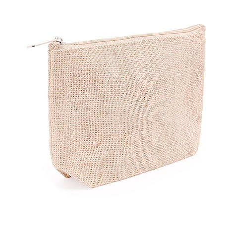 Elegancka kosmetyczka z jutowego materiału, wyposażona w dopasowany zamek błyskawiczny oraz puller z juty.