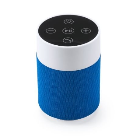 Bezprzewodowy zestaw głośnomówiący Bluetooth 5.0 w białym kolorze z gumowym wykończeniem. Urządzenie wyposażone jest w dotykowy panel sterowania oraz wielokolorowe podświetlenie LED w podstawie, które losowo zapala się w rytm odtwarzanej muzyki.