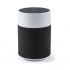 Bezprzewodowy zestaw głośnomówiący Bluetooth 5.0 w białym kolorze z gumowym wykończeniem. Urządzenie wyposażone jest w dotykowy panel sterowania oraz wielokolorowe podświetlenie LED w podstawie, które losowo zapala się w rytm odtwarzanej muzyki.