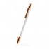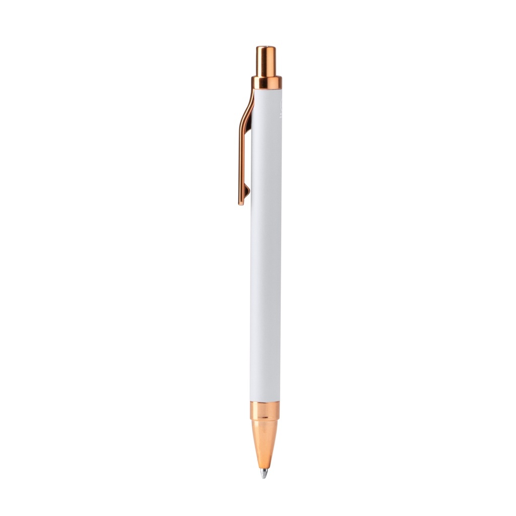 Długopis z aluminium pochodzącego z recyklingu, o matowym, jednolitym wykończeniu z miedzianymi detalami. Wyposażony w duży wkład z niebieskim atramentem, zapewniający płynne pisanie i dłuższe użytkowanie.