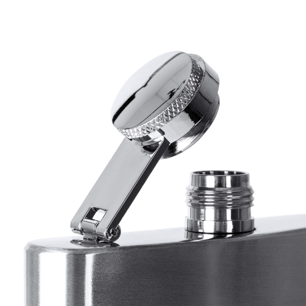 Piersiówka ze stali nierdzewnej, wyposażona w zakrętkę zabezpieczającą przed rozlaniem, o pojemności 175 ml.