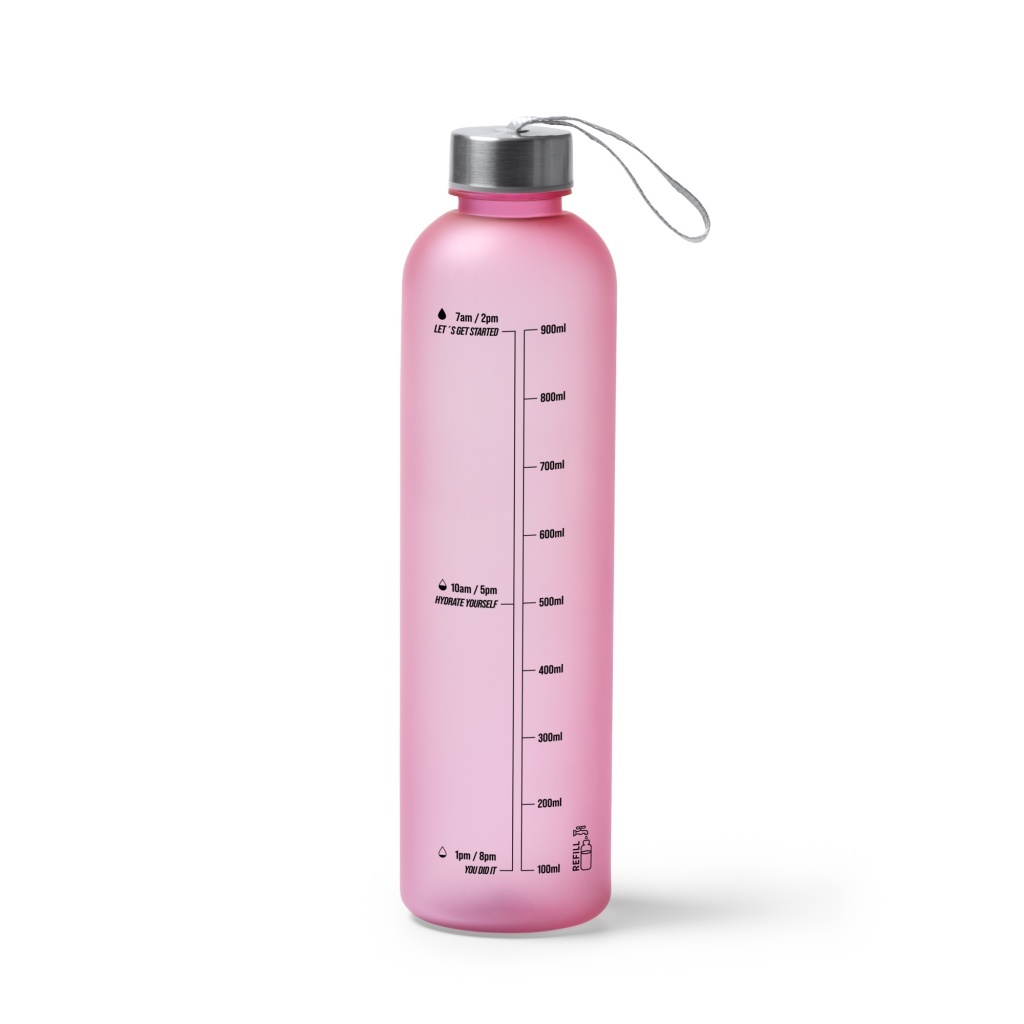 Butelka z tritanu o półprzezroczystym korpusie, wyposażona w zakrętkę i wygodny uchwyt do przenoszenia. Zawiera wskazówki dotyczące nawadniania oraz wskaźnik poziomu płynu. Pojemność: 1 l. Zapakowana w eleganckie pudełko.