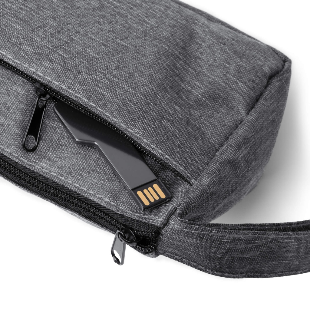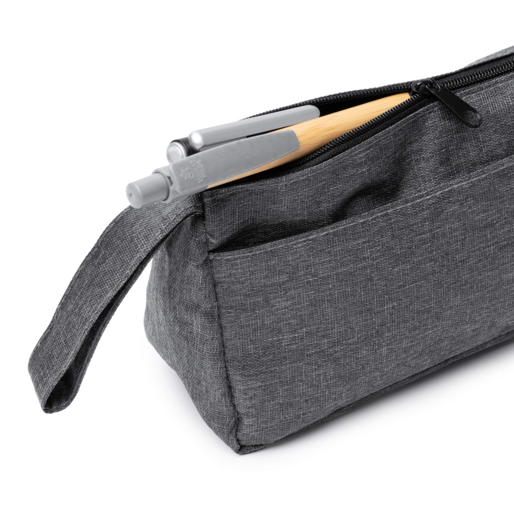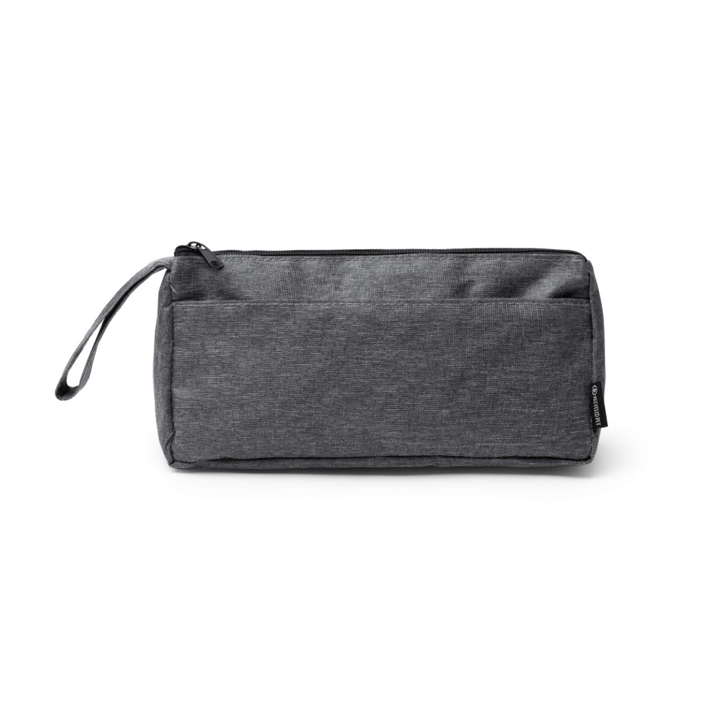 Etui/kosmetyczka z tkaniny 300D RPET. Główna komora oraz zewnętrzna kieszeń zamykane na zamek błyskawiczny. Wyposażona w praktyczny uchwyt do przenoszenia.