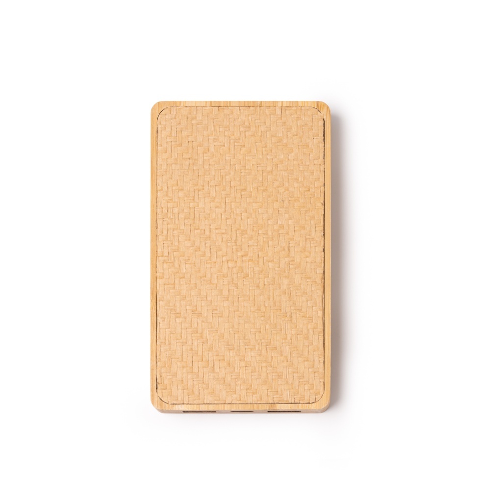 Powerbank o konstrukcji zrobionej z bambusa i podstawie z naturalnych włókien. Pojemność: 8000 mAh. Wejście USB typu C. Jeden port wyjściowy USB typu C oraz dwa porty wyjściowe USB. W zestawie znajduje się kabel. Produkt zapakowany w pudełko zaprojektowane z myślą o środowisku.