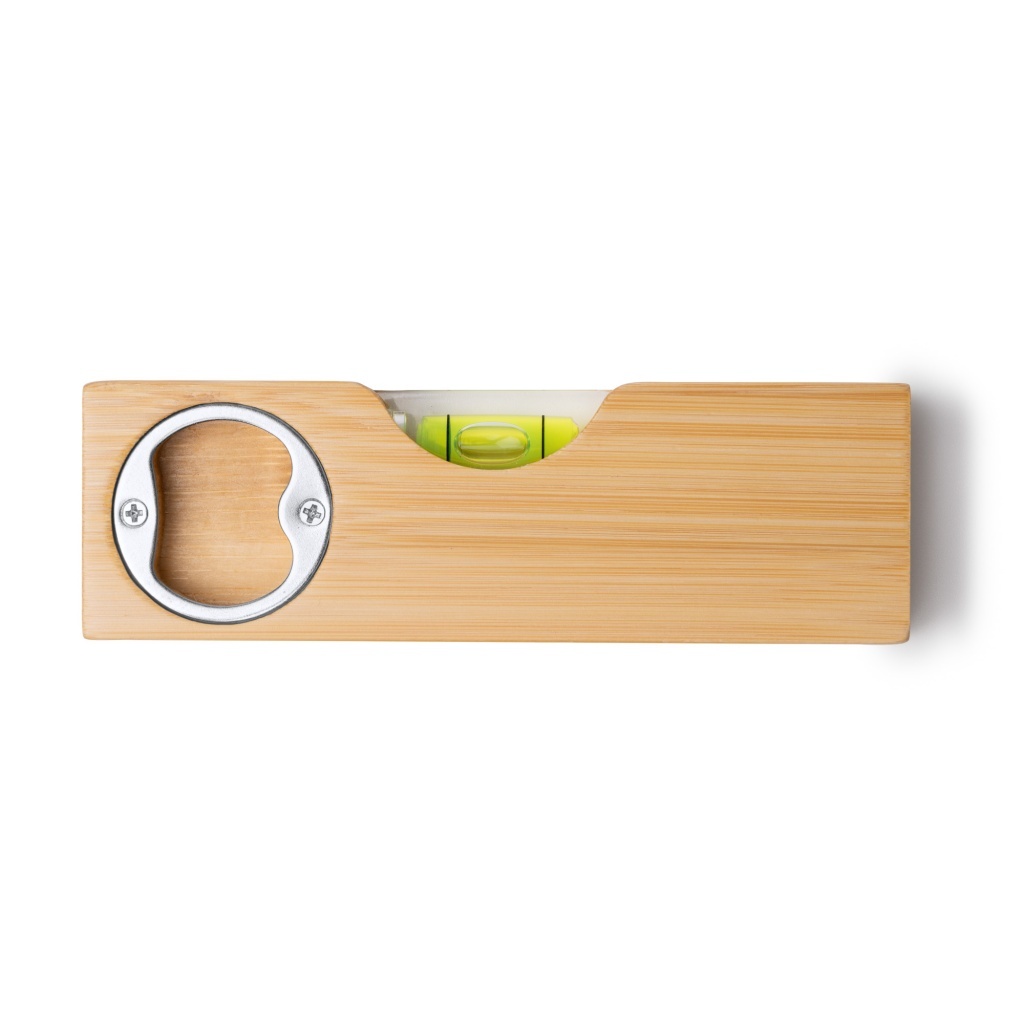 Poziomica wykonana z bambusa, posiadająca w korpusie wbudowany metalowy otwieracz do butelek.