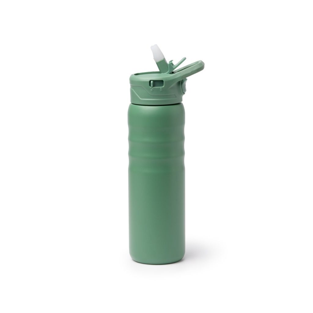Butelka termiczne z podwójnymi ściankami wykonany ze stali nierdzewnej 304 pochodzącej z recyklingu. Pojemność: 710 ml. Pokrywka ze składaną słomką ze zintegrowaną powłoką silikonową, osobnym zamknięciem i systemem automatycznego otwierania obsługiwanym za pomocą przycisku. W zestawie znajduje się również blokada otwierania pokrywki i system zapobiegający kapaniu, dzięki silikonowej powłoce i pierścieniowi wbudowanemu w szyjkę butelki. Pokrywka zawiera również uchwyt do przenoszenia.