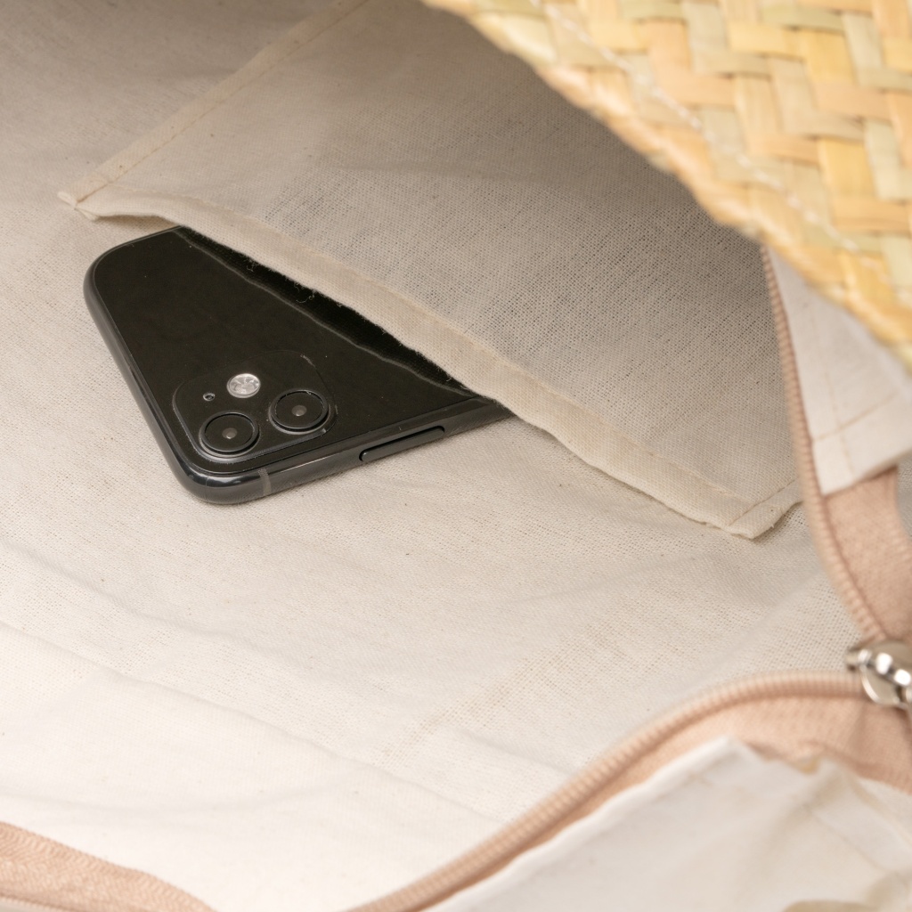 Torebka ze słomkową powierzchnią zewnętrzną i bawełnianą podszewką. Posiada obszerną komorę główną zapinaną na zamek błyskawiczny i długie uchwyty ze skóry PU, oba o pasującym wykończeniu. Zawiera wewnętrzną kieszeń do przenoszenia małych przedmiotów i przednią powierzchnię idealną do brandingu.