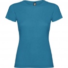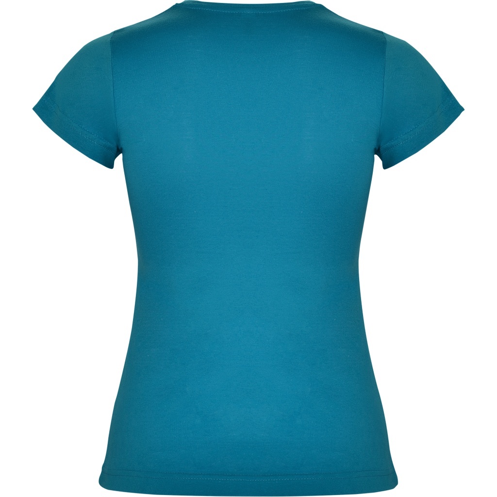 Dopasowana koszulka damska. Zaokrąglony, dwuwarstwowy ściągacz przy szyi, typowo damski fason. Wzmocnione, kryte szwy przy kołnierzyku i na ramionach, szwy boczne.