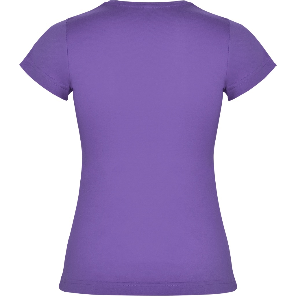 Dopasowana koszulka damska. Zaokrąglony, dwuwarstwowy ściągacz przy szyi, typowo damski fason. Wzmocnione, kryte szwy przy kołnierzyku i na ramionach, szwy boczne.