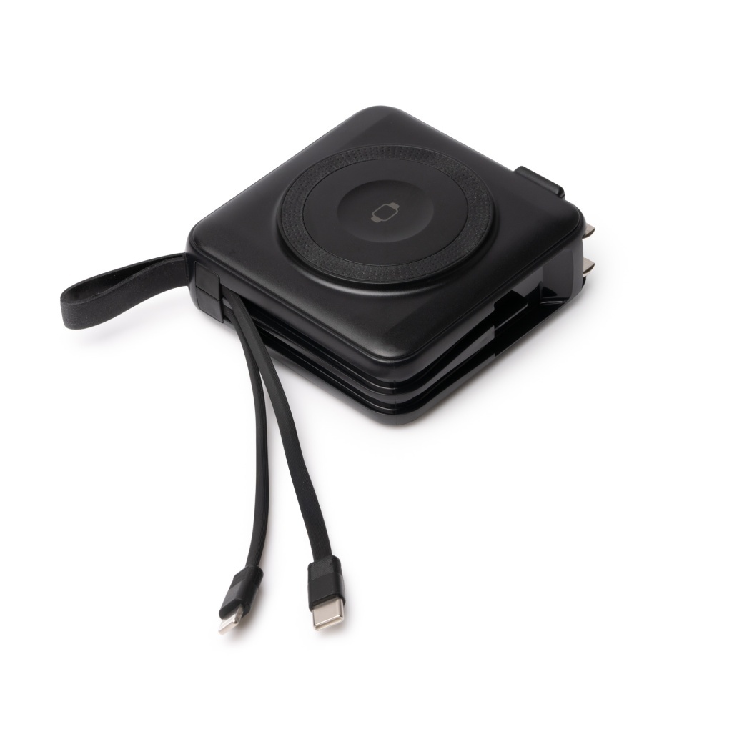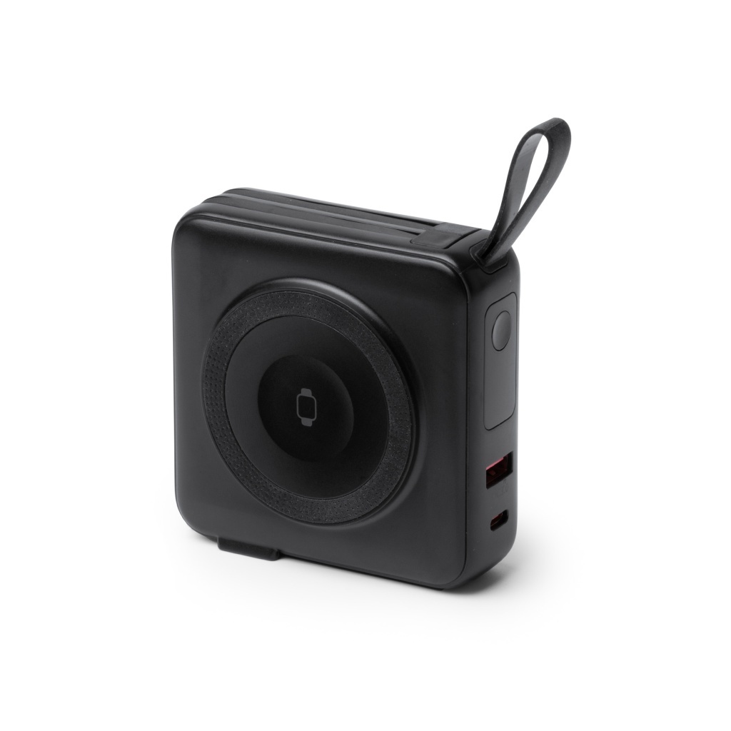 Powerbank 3 w 1 o pojemności 10 000 mAh z szybkim ładowaniem: 15 W przy ładowaniu bezprzewodowym oraz 20 W przy ładowaniu przewodowym. Obudowa z tworzywa ABS, z wbudowaną bezprzewodową bazą do urządzeń obsługujących Qi. W korpusie znajdują się zintegrowany kabel USB typu C oraz kabel Lightning, a także czytelny wyświetlacz pokazujący procentowy poziom naładowania.