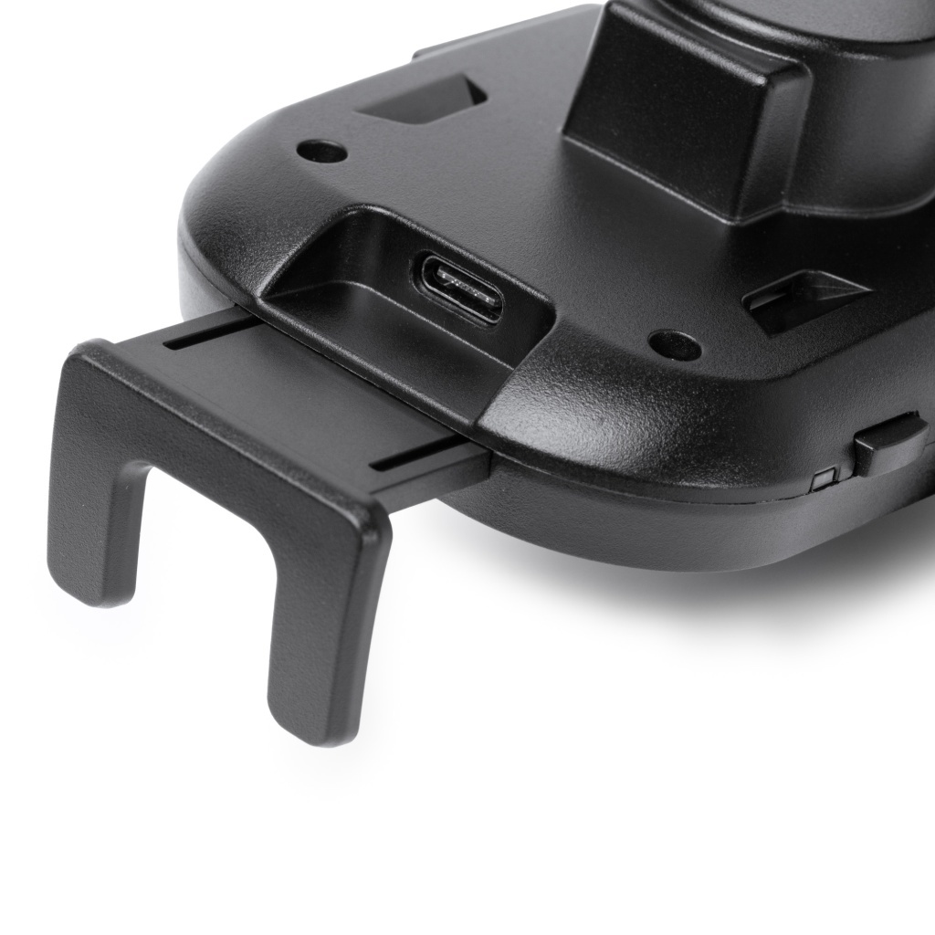 Samochodowy uchwyt na smartfona z bezprzewodowym ładowaniem do 15 W oraz dwoma wymiennymi sposobami montażu. Jeden element mocujący to mechaniczny zacisk do kratki wentylacyjnej, drugi to przyssawka na przednią szybę z wysuwanym ramieniem dla optymalnego ustawienia. Obracany mechanizm pozwala łatwo dopasować kąt widzenia. Uchwyt obsługuje wszystkie urządzenia zgodne z bezprzewodowym ładowaniem, oferując bezpieczne trzymanie dzięki automatycznym bocznym zaciskom oraz dolną ręczną regulację wysokości.