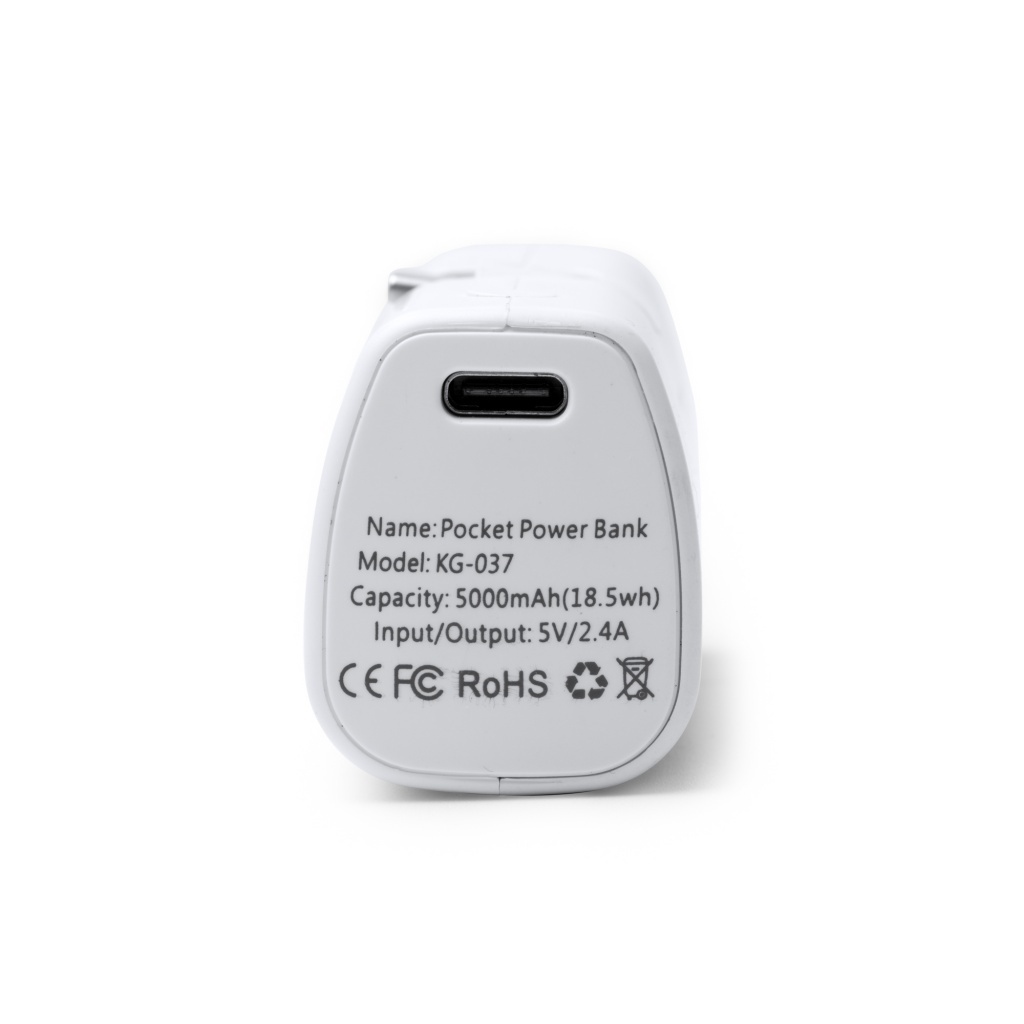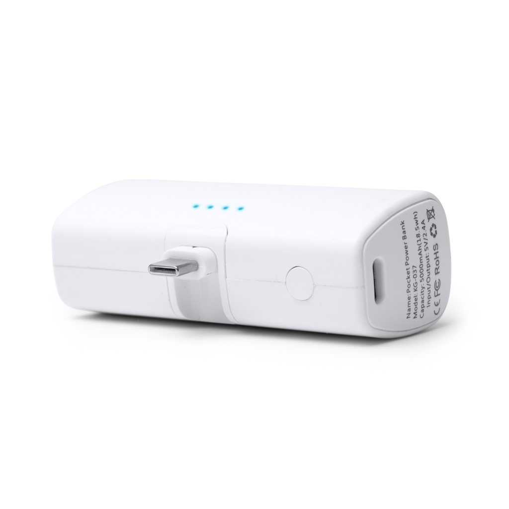 Powerbank o pojemności 5000 mAh wykonany z tworzywa ABS pochodzącego z recyklingu, wyposażony w funkcję latarki LED oraz składane wyjście USB typu C.
